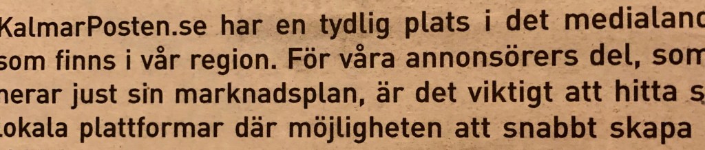 Den första: Kalmarposten -anställer(!) webbredaktör och får en egen plattform. Enligt kappan, så heter det när förstasidan byts ut mot en egenannons, utlovas ”nyheter” från Kalmar. Jag sätter nästan i halsen. Kalmarposten med sloganen ”Glad och gratis” är allt utom nyheter. I Kalmarposten är annonserna överställd texten. Den redaktionella texten pysslas ihop mellan de enorma mängderna av framförallt små annonser. Texterna är glada nedslag i galapetteri, trivselterror och riktigt bra personporträtt – utan svåra frågor.