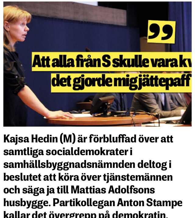 För övrigt; Samhällsbyggnadnämndens majoritet gråter ut i en insändare angående beslutet att ge nämndens ordförande ett positivt förhandsbesked för bygglov i Hossmo. Det mynnar ut i ett ynkligt ”vad skulle vi annars göra.” Jag säger som tidigare, ni hade kunnat låta Växjö eller Karlskrona ta beslutet. Att försöka intala mig och många andra att ni inte är jäviga är så konstigt: ”vi känner inte Adolfsson personligen…” kvarstår ändå det faktum att tjänstemännen ville avslå begäran. Närmsta grannen – Kyrkorådet i Hossmo/Dörby överklagat beslutet. Fortsättning följer…