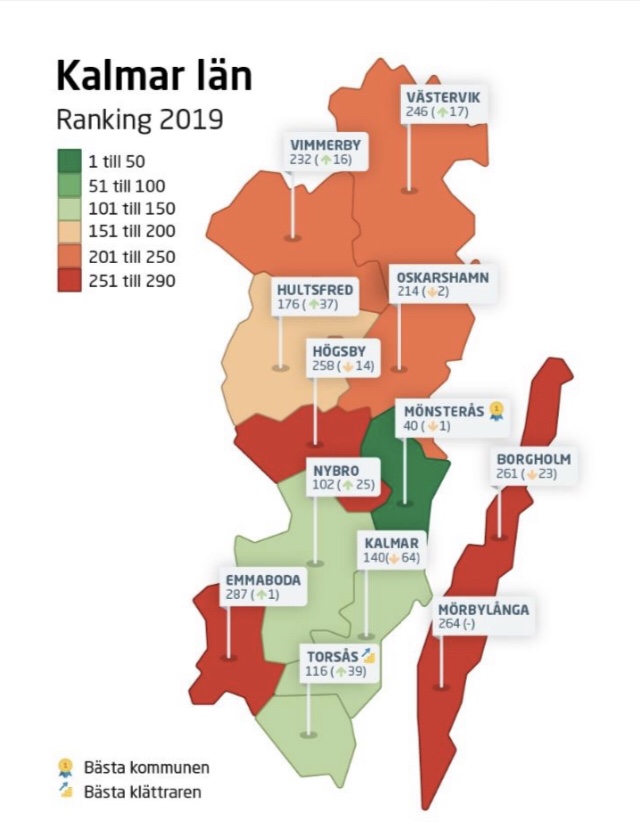 Att rankas högt i Svenskt näringsliv enkät om företagsklimatet är också en viktig del av Kalmars självbild. Självklart vill vår kommun vara den bästa för företagen att finnas i. Tidigare år har vi legat högt på listorna men i 2019-års ranking faller Kalmar som en sten – 64 placeringar. Fallet är störst i hela länet. Kalmar kommun har gått från att ha legat bland landets 100 bästa företagskommuner till att ha blivit en mellanbra kommun. Det går inte bra för Kalmar… Bästa kommunen när det gäller företagsklimat är Mönsterås kommun, som gått om Kalmar och ligger bland de 100 bästa. Grattis Mönsterås.