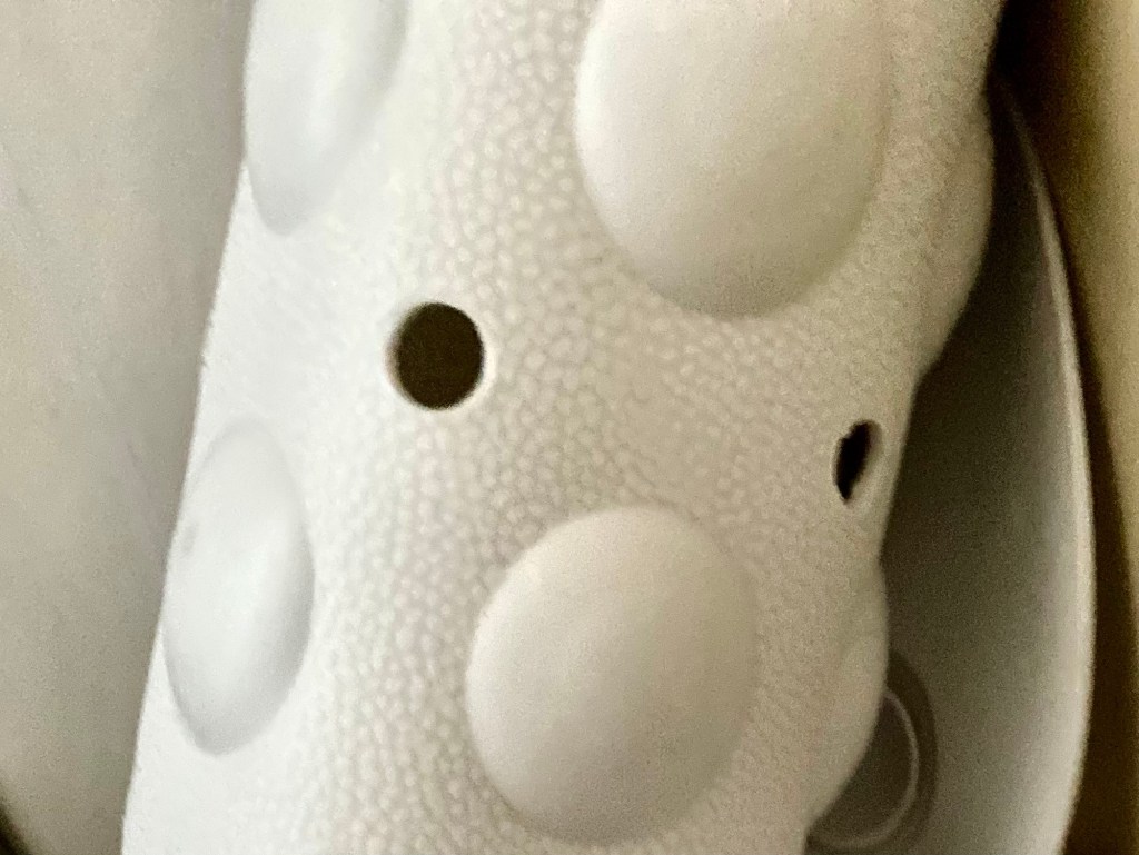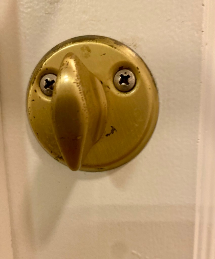 Och på toa finns en liten illmarig typ i dörrens trävita yta, lite yvigt, retfull blick. Ett troll? I en hink stirrar badmattan och ser utmattad (!!) ut.
