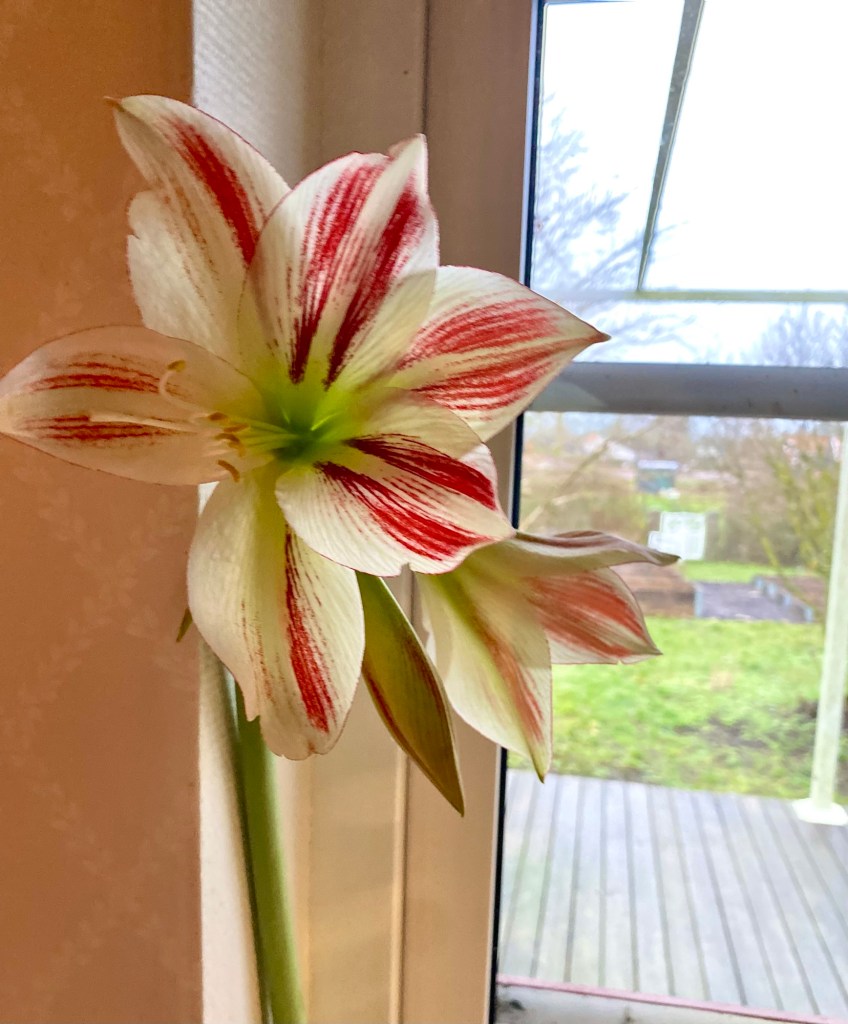 Detta med odling är svårt. Jag köpte hyacinter hos Lotties som stod i knopp. De slog inte ut, bara vissnade. Köpte nya hyacinter på ICA köpstaden och fick hyacintdoft till nyår. En amaryllis jag köpte gav full utdelning, tre stora klockor. Den sista. Klippte jag av till snittblomma och den stod 14 dgr. Varför är jag då så lat när det gäller odling? Sparade häromåret tre amaryllislökar inslagna i tidningspapper i fruktlådan i kylskåpet. Glömde bort dem . När jag undrade vad som låg längst in i fuktlådan efter åtskilligt tid var det tre ruttna lökar🤣😂