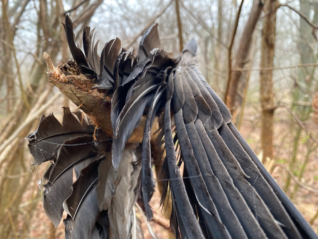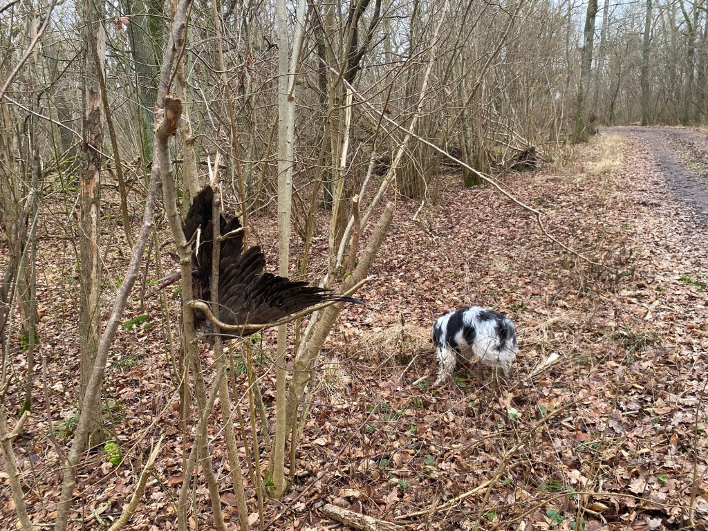 Nu senast hoppade hon in i ett buskage och kom ut med en hel vinge av något slags rovfågel. Bytet var för stort för att lägga i en bajspåse. Jag slängde upp eländet i ett träd. Tillräckligt högt upp för att Maggie inte skulle nå även om hon ställde sig på tå. Men hon försökte!
