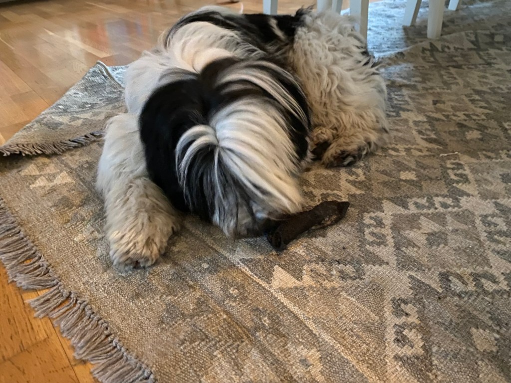 Med samma frenesi som hon gräver upp potatis gräver hon ned halvätna tuggben. Gärna i rabatterna. Där får de ligga i några veckor. När benen mjuknat och ser ut som gråslemmiga disktrasor bär hon in dem och lägger dem på mattan under matsalsbordet. Vi upptäcker dem först när det ”redan är försent”. Under Maggies massiva hårman går det inte att se vad hon bär med sig in från trädgården.